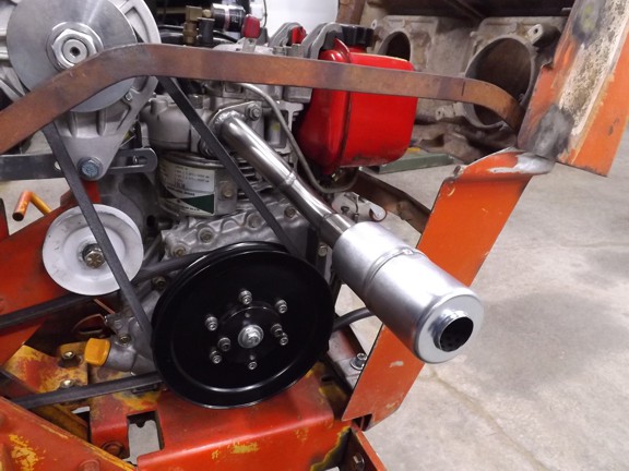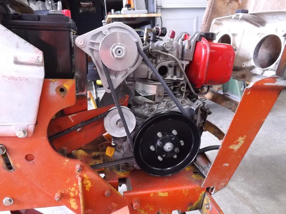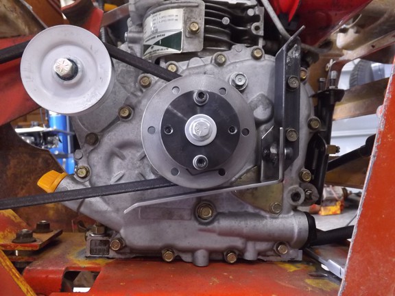 At this point I temporarily mounted the transmission back into the chassis for mockup (waiting on some new seals) so I could work out the engine pulley geometry and belt length. I needed to make the “belt rest” that will hold the slack belt when the belt tensioner is disengaged (seen below). Note: this style of drive train uses belt tension to act as a clutch to disengage the engine from the transmission. When engaged, a belt tensioner pulls the belt tight against the engine pulley and when disengaged it allows slack to let the pulley slip over the pulley.