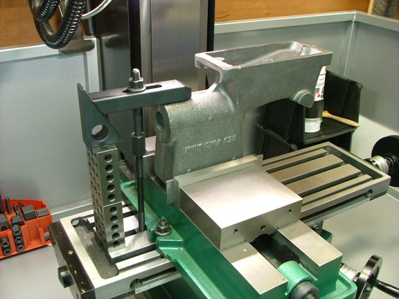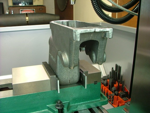 Now it’s worth mentioning that castings can vary in size and shape depending on when they were produced and by whom so it is important to get a good idea of where the part will be referenced by the drawing. By that I mean if the casting is 6” tall and the machined part is 5.75” tall you must determine where to cut off the excess metal. After studying the prints a bit more I decided to reference the engine frame off of the base of the casting and all subsequent measurements will be made off of this “0” reference. I mounted the frame hopper down in my 5” mill vise with a couple of parallels to clear the bumps that are cast into the sides of the water hopper (seen below). The manual suggests milling down a flat surface on the top of the hopper to assist in this procedure although I don’t like the idea of messing with the finish of the casting so I will do this without milling.