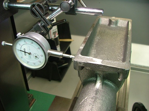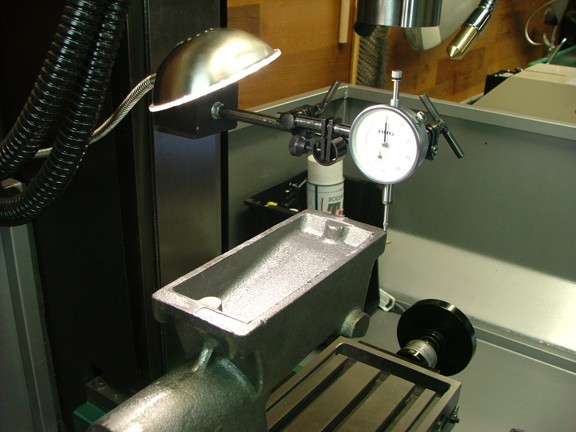 Now that the casting is vertical in the “Y” axis I needed to check level it in the “X” axis. I used a dial indicator to roughly measure the difference in height from the back side to the front (seen below). I was really close so I tightened the vise and rechecked all measurements.