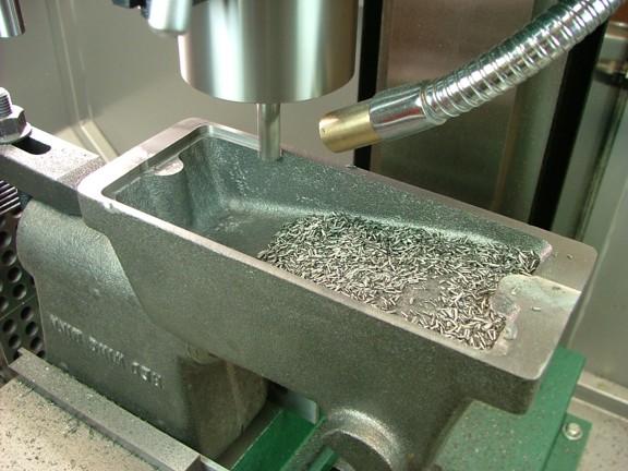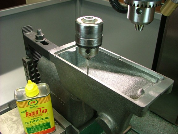 Using an old 3/8” drill chuck as a handle I tapped out the holes with a 2-56 tap. I like to use the drill chuck as it provides more torque control over a “T” handle tap holder. The last thing you want to do is start off with a tiny broken tap in your casting. The cutting fluid is really not necessary in cast iron although I used it in this case to insure success.
