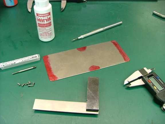 Before I drill and tap the holes I will make the fuel tank bottom out of the .032” thick steel plate provided in the Red Wing materials kit. I layed out the holes in the plate so that the outer four holes were .130” in from the outer edges. The two inner holes of the six will be just inside the edge of the plate and will be cut after the center holes are tapped. I drilled the four outer holes with a #49 drill bit (not shown). Now before I go any further I think it is worth mentioning that I accidentally spilled 3 ounces of red layout fluid (Dykem) all over my garage floor (not shown). I tipped over the applicator bottle on the floor and the cap snapped off and sprayed fluid all over the shop floor in a ten foot diameter!!! :0( Luckily it spared everything but the concrete but left stains where the floor sealer was cracked which looked hideous. I used a quart of acetone to clean up what I could but the rough spots on the concrete were bright red :0( Nothing would take the stain out so I was pretty bummed. I decided to try different cleaners and ended up using household bleach as my final try. I was super surprised to see the bleach take out every trace of the red layout fluid as if it had never been spilled. I now use the 2 ounce felt applicator version of the Dykem (seen below) so that never happens again ;0)