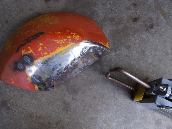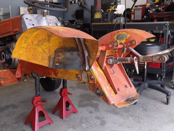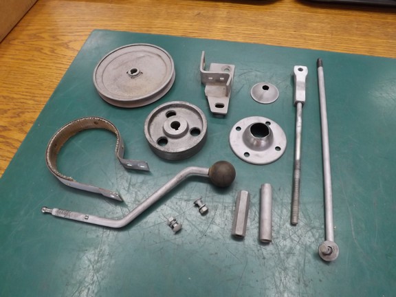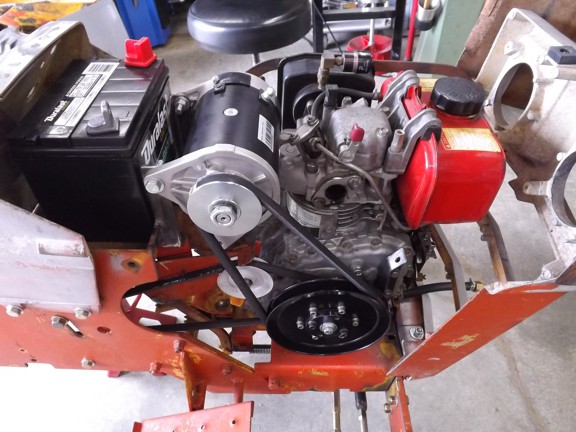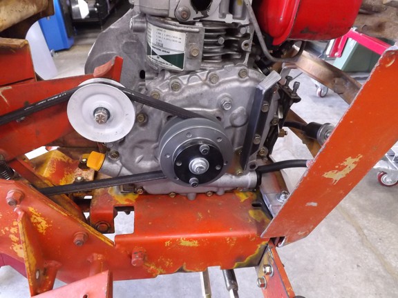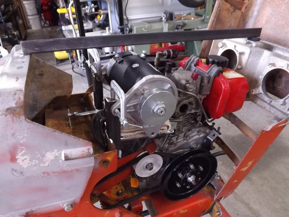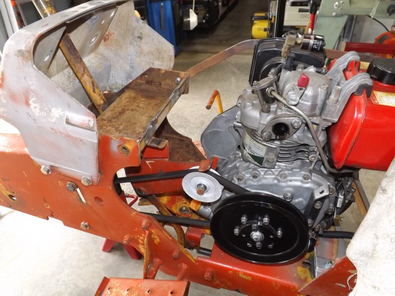 At this point I temporarily mounted the transmission back into the chassis for mockup (waiting on some new seals) so I could work out the engine pulley geometry and belt length. I needed to make the “belt rest” that will hold the slack belt when the belt tensioner is disengaged (seen below). Note: this style of drive train uses belt tension to act as a clutch to disengage the engine from the transmission. When engaged, a belt tensioner pulls the belt tight against the engine pulley and when disengaged it allows slack to let the pulley slip over the pulley.