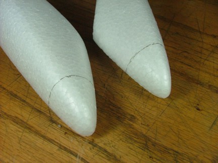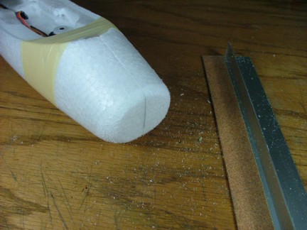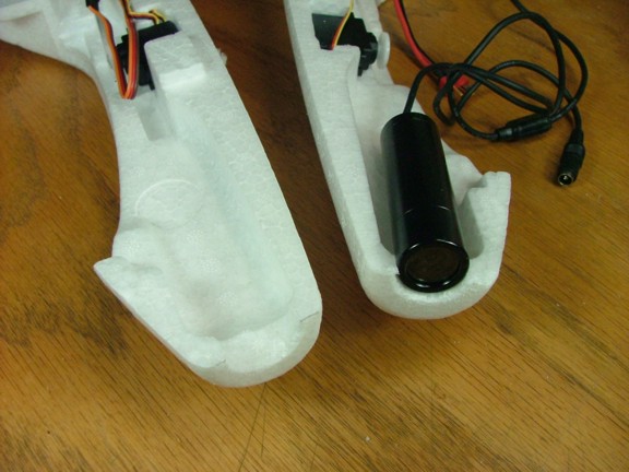 The next step was to prepare the nose of the aircraft for the camera port. This will be the hole that my PC75WR “bullet” camera will mount in. I started out by tracing a line around the nose of the plane. I angled this cut slightly down as the camera will be mounted at about a 6 degree angle to the incidence of the wing. This will help the pilot navigate better when looking at the transmitted video image. I used my Stanley razor knife to cut the nose off (despite the planes good looks :0)