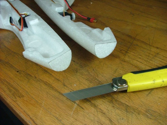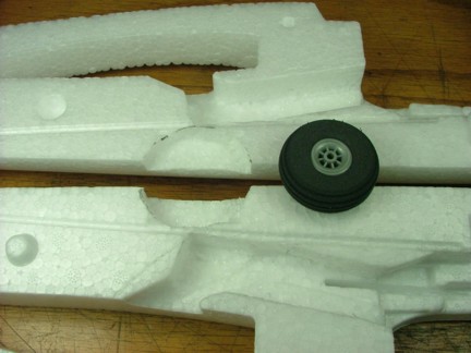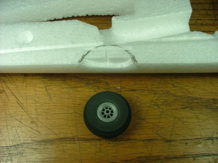 I used my Stanley knife to cut out two half moons where the wheel will be mounted. I left an 1/8” gap on both sides of the wheel and all around the radius. This location is perfect for the wheel as it is an inch or so in front of the CG which will provide just enough tail weight for it to land correctly. Notice that the pocket just barely touches the battery slot.
