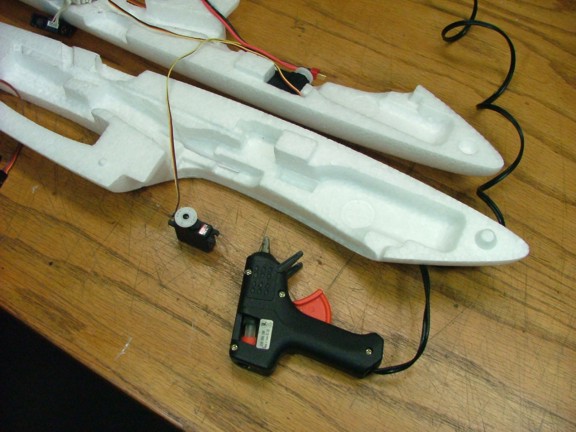 High-temp hot glue was used to secure the HS-81 servos into the fuselage halves. This way they can be removed later for repair/replacement. Hot glue can be very useful when working with foam models as it is very easy to use and holds foam very well.