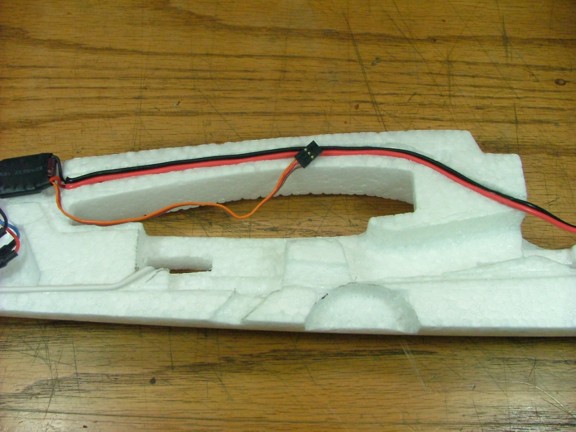 A small groove was cut into the inside face of the fuselage to accommodate the power wires. The 18 gauge wires were then glued into the groove for added strength and so they do not move while glueing the two fuselage halves together. A small groove was also cut out for the servo lead of the speed control towards the bottom rear of the wing saddle. This is to allow the lead to be removed if necessary once the fuselage is glued. Notice the antenna tube as it is turned up in the receiver bay.