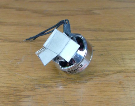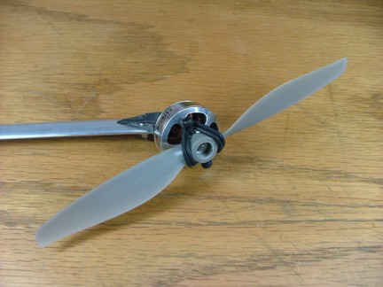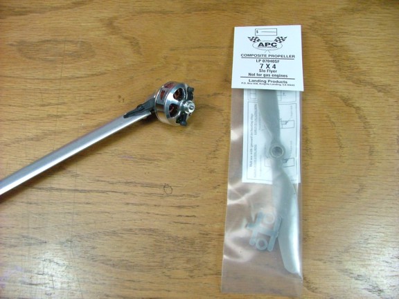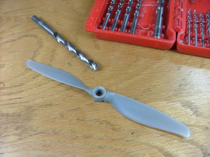 The next step was to modify the 7 x 4 APC Slow Flier prop to fit the Ultrafly motor in “pusher” mode. The APC prop normally comes with a “stepped” hole for mounting where the big hole side is use to mount to a brushless motor with a rubber band mounting system. Since I will be using the APC prop as a pusher, I will need to drill out the mounting hole to allow the hub of the Ultrafly motor to fit. I used a 7/16” drill to ream the prop out. I installed the factory prop mount screws into the motor and used a couple of O-rings as rubber bands to hold the prop in place.