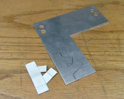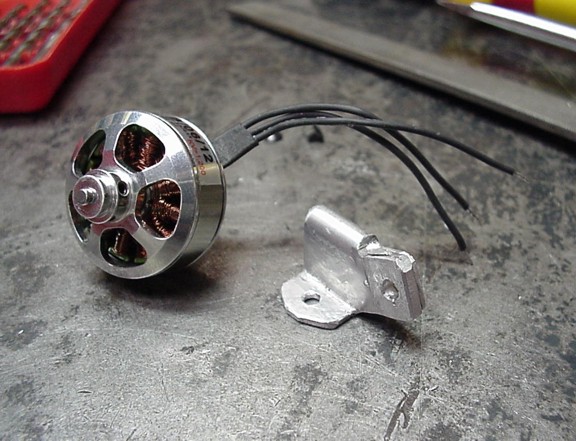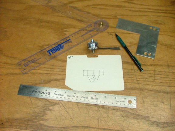 The next step was to build the motor pylon that will support the Ultrafly brushless motor. Using some cardboard I cut out a template that will make up the motor support bracket. This bracket will bolt the motor to a pylon tube that will hold it above the fuselage. Notice that the bracket straddles the exposed motor shaft, this was done for aesthetics only. I cut the bracket out of some scrap aluminum and formed it like my test pattern template.