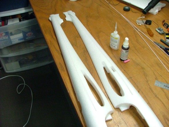 I now had to make the decision on where to mount the pylon as this will effect the planes CG greatly. I “installed” a majority of the parts in the fuselage and taped it together temporarily. The tail section and the wings were also temporarily taped on to the fuselage. I then balanced the plane moving the motor back and fourth till the pane was somewhat balanced. What I came up with was to mount the motor about 5” behind the trailing edge of the wing. A slight groove was cut out of the foam to allow for the installation of the motor pylon in each fuselage halve. The pylon was then cut to length to just clear the propeller over the fuselage. A pocket for the Apollo 12 speed control was made just in front of the pylon as well. I made this pocket kind of snug so the speed control will not come loose. Some 22 gauge wire was soldered onto the motor leads to extend them through the motor pylon. Then 3.5 mm bullet connectors were soldered onto the motor leads allowing them to be connected to the speed control. The power lead of the speed control was also extended to reach the battery connector up front. I used 18 gauge wire for the power lead, solder and shrink-wrap was used for the connections. Sandpaper was used to roughen up the lower part of the motor pylon and then thick CA was used to bond it to the fuselage half.