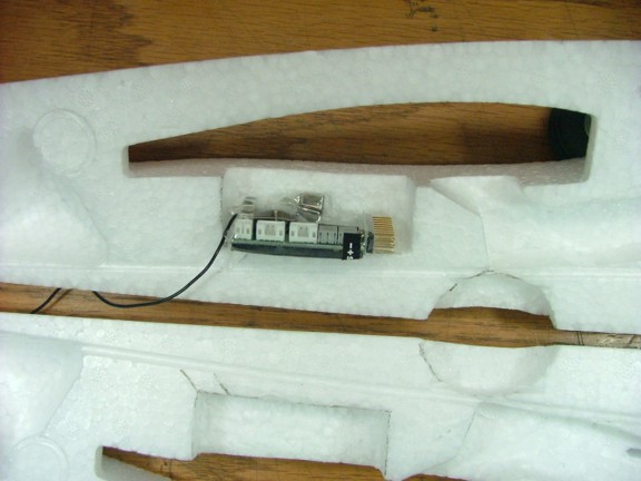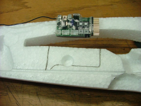 The next step was to make a bay for the FS8 receiver. I decided to install the receiver under the wing saddle to provide more space in the nose of the plane. This location will also keep some physical distance from the future video transmitting equipment in the nose. The video transmitter puts out a 1/2 watt of power which can cause problems with some electronics in close proximity. I cut a slot out that was just wide enough for the receiver and a little longer to allow for connection of the servos. Notice the slot on the bottom of the cutout, this will be used to install the antenna in the future antenna tube.