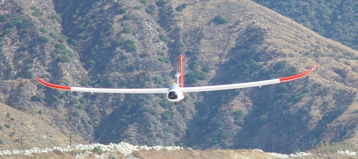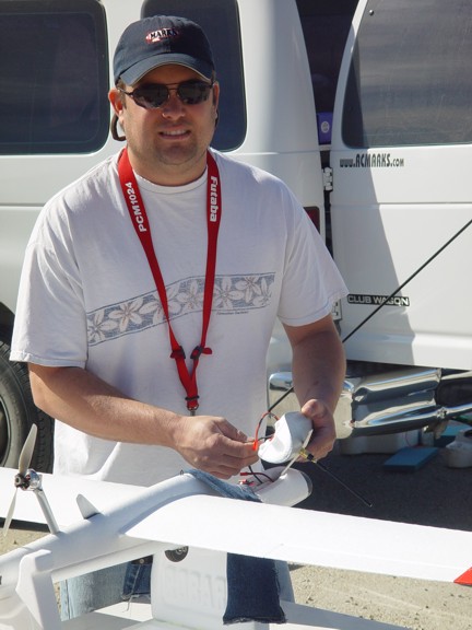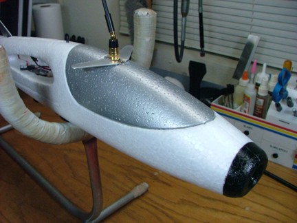 Plane: Multiplex Easy Glider - Non-powered model ($70) Material: EPP foam or “Elapore” TM. Spar: Carbon fiber dowel (hollow) Wingspan: 71” Wing area: 645 sqin CG: 2-3/4” behind the leading edge at the root. Total weight including batteries: 42 ounces Total weight wing loading: 9.375 oz per sqft Servos: 2-Hitec HS-81 servos ($17 each) and 2-Hitec HS-55 servos ($14 Each) Batteries: 1-Thunder Power 3C/2100 for the drive motor ($85) and 1-Thunder Power 3C/1320 for the camera system ($55) Motor: Ultrafly B/06/12 1200 KV outrunner motor ($44) Speed Control: Ultrafly Apollo 12 programmable ESC ($28) Prop: 7 x 4 APC Slow Flyer Radio receiver: FMA Direct FS8 Co Pilot on 72 MHz ($120) Video transmitter: Supercircuits AVX900T4 900 MHz ATV transmitter. Transmits @ 500 mW PEP and draws 250 mA @ 12 volts on 910.10 MHz. Transmitter has a 1 mile line-of-sight range and weighs 0.75 oz ($75) (Requires Ham license) Video receiver: Supercircuits AVX900R1 audio/video ATV receiver ($95) Video camera: Supercircuits PC75WR Sony Ex-View 1/3” CCD chipset 380 TV lines of resolution with 0.05 Lux light rating. 55 degree field of view. Draws 100 mA @ 12 volts and weighs 1.6 oz ($120) Microphone: Supercircuits PA3 amplified microphone ($8) Paint: Top Flite LustreKote polyurethane ($7)